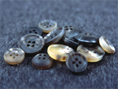 水牛の角を削った本水牛ボタンは、重厚で高級な雰囲気 があります。 形状は、クロス止めがきれいに糸付けできるツヤ消しタイプ(20ミリ、15ミリ)とスーツにアクセントをつけるツヤありタイプ、ボタンを止めやすくするためにお碗状の形をしたタイプ(19ミリ、14ミリ)の3種類ご用意しております。